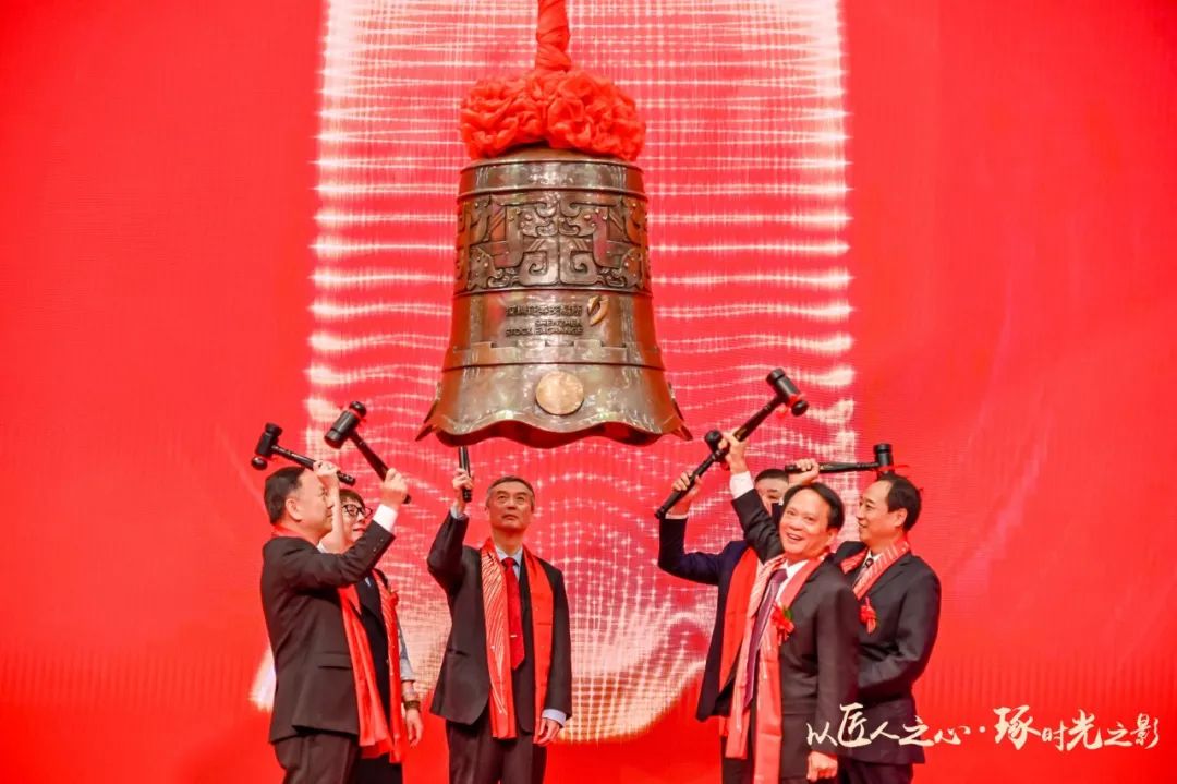 緊接著,由東鵬控股董事長何新明、清遠(yuǎn)市委常委、常務(wù)副市長呂成蹊、佛山市副市長趙海、中國建筑衛(wèi)生陶瓷協(xié)會會長繆斌、東鵬優(yōu)秀經(jīng)銷商代表伍鴻達(dá)、東鵬核心技術(shù)骨干代表姜安寧共同敲響開市寶鐘。